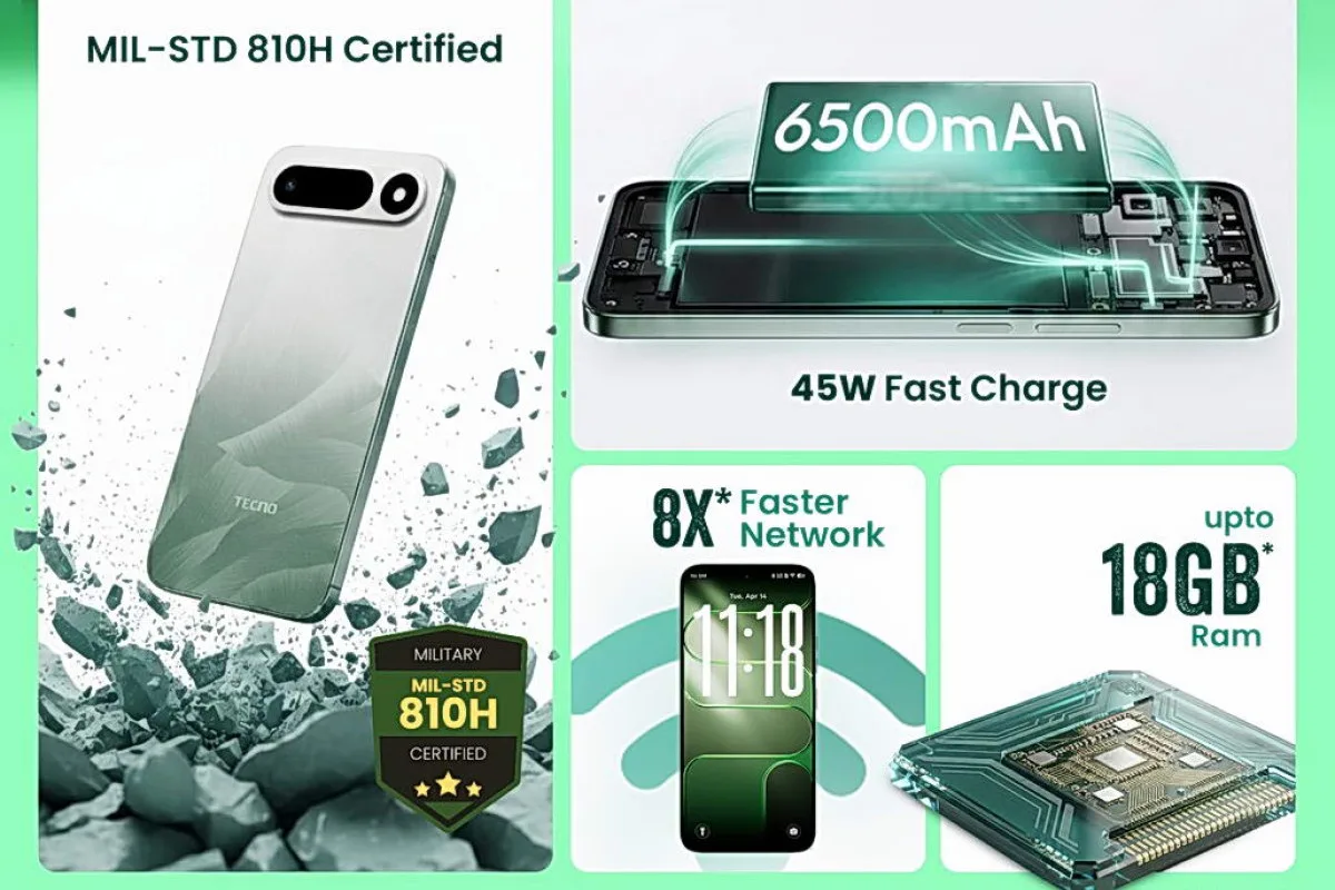 Tecno equips the Pop X 5G with a 6,500mAh battery, supported by 45W wired charging, aiming to deliver extended usage on a single charge.